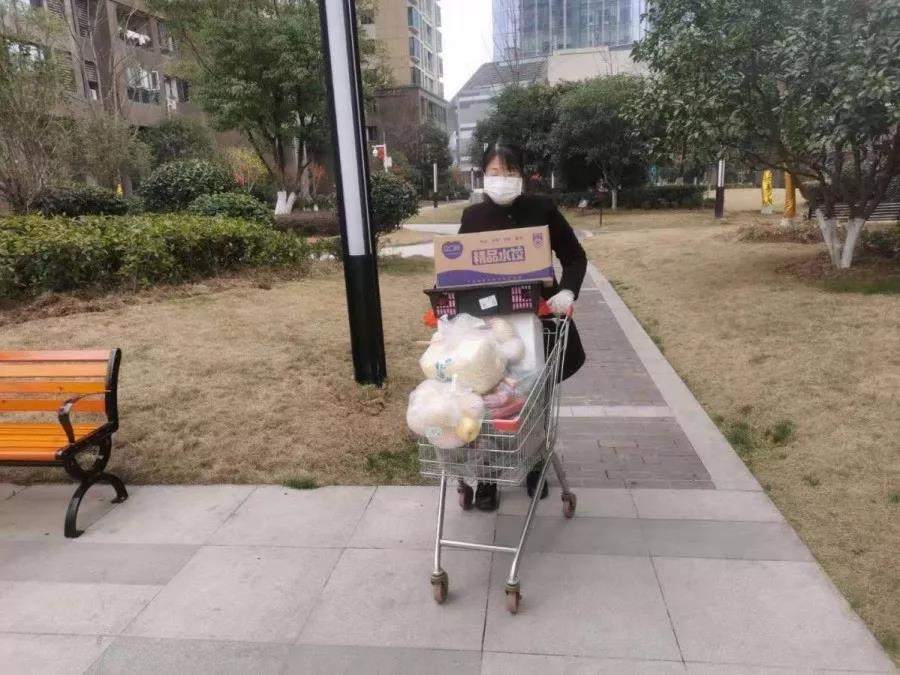 采购的“仗”可不止在排队,每日早上生鲜超市大概要排45分钟左右才能进场,她和小伙伴们分工合作、按清单拣货买单,没有机动车可帮忙,她们就推着超市的购物车回到小区进行分装,业主方便下楼拿的、她们就给存着;老人家和在家隔离的业主们,她们都亲自将肉菜、家居用品还有不便拿的快递,一块送到家门口。上午整套采购流程下来,要花3-4小时的时间。