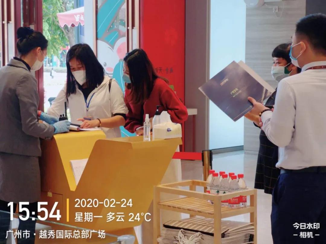 前往越秀·星悦城和越秀·云悦湾的客户到达现场后,由工作人员协助进行核查健康码、测体温、登记信息、消毒等防疫安全检查工作后方可进入看房。